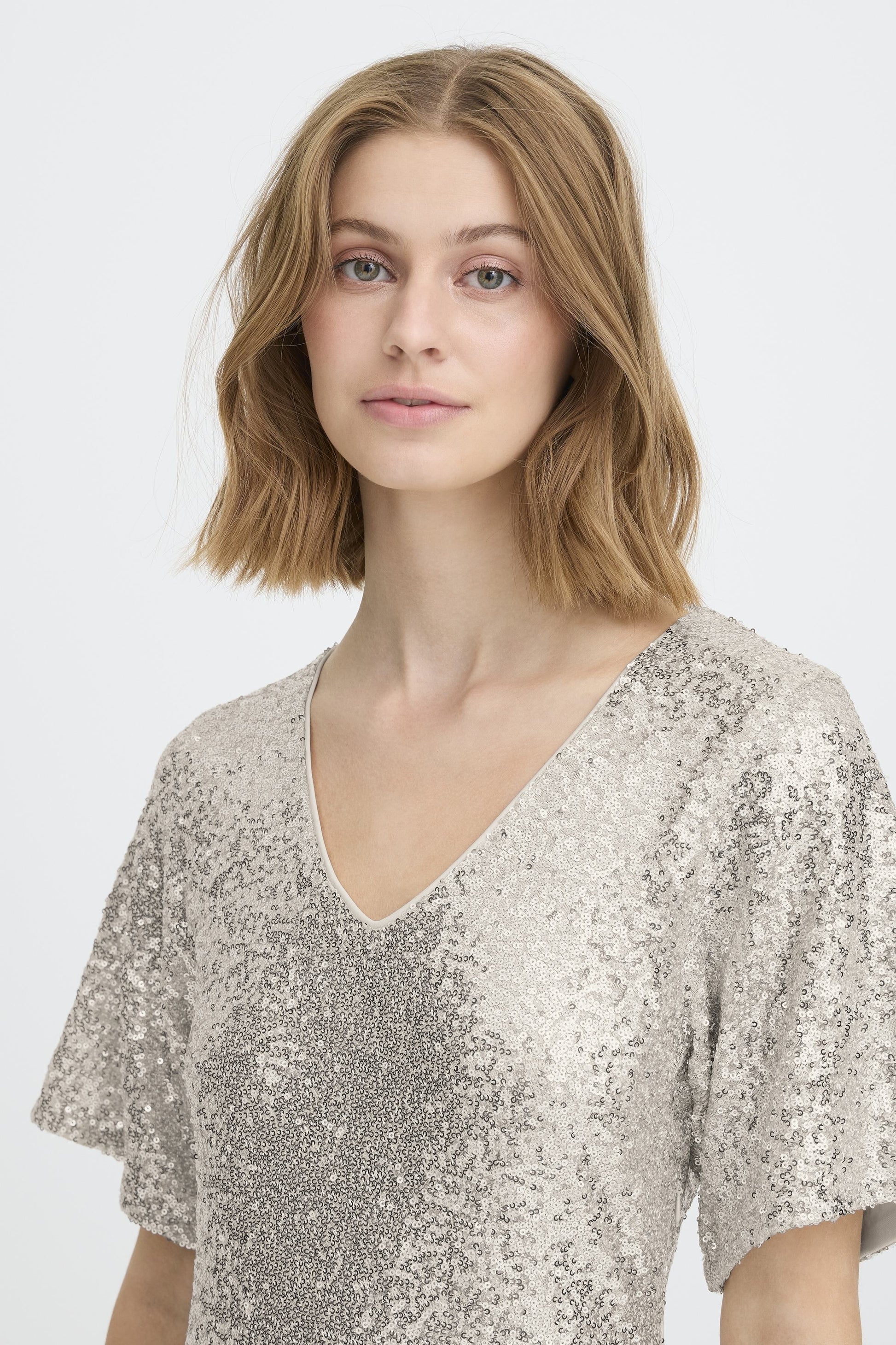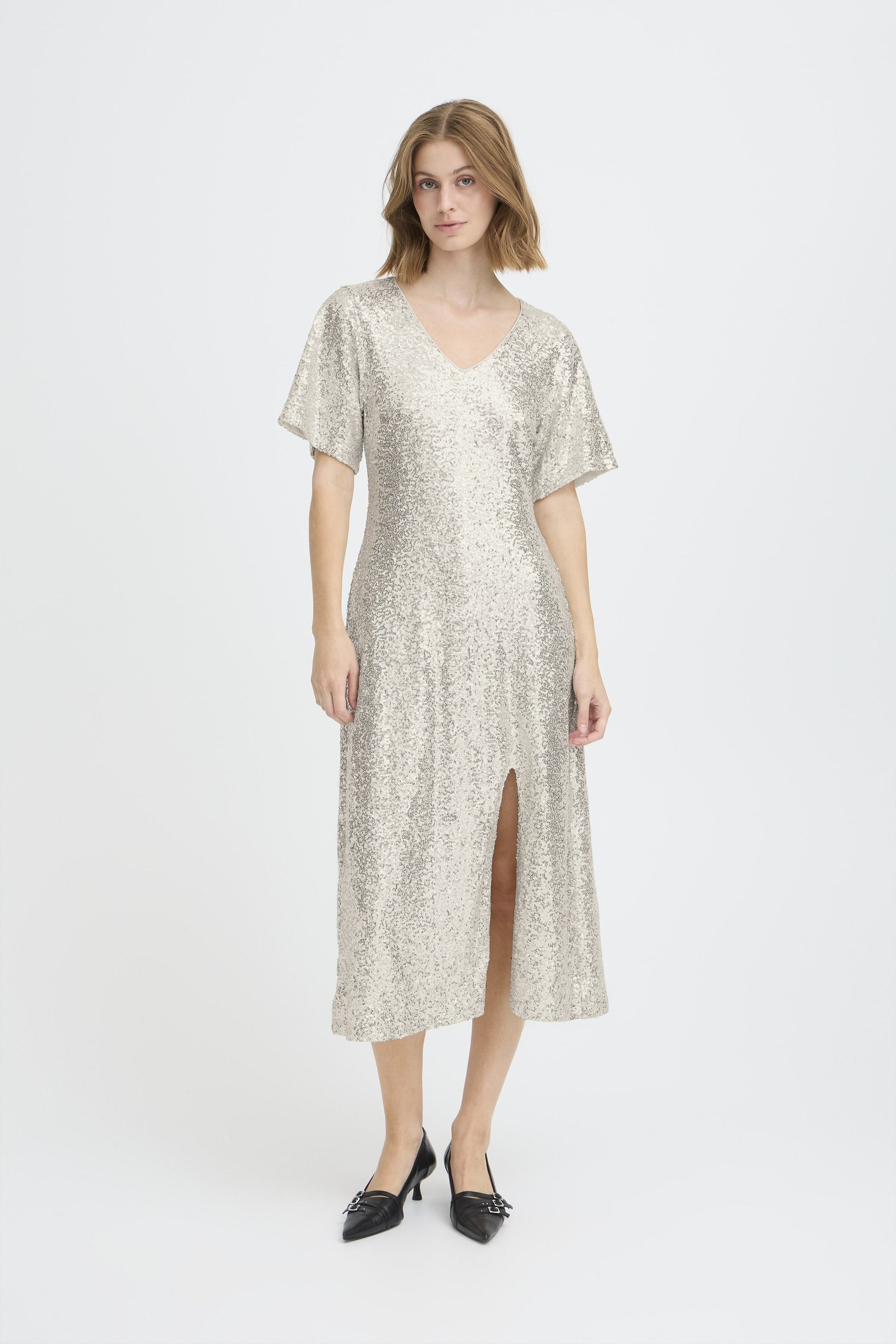 V neck midi length dress with shortsleeves.