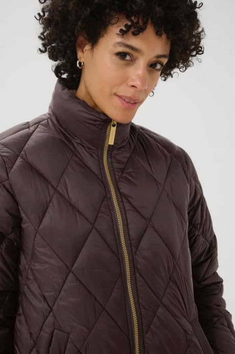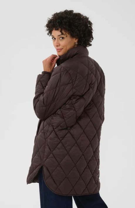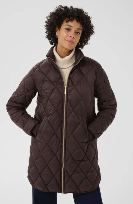 This quilted coat features elegant diamond stitching and a flattering, slightly oversized silhouette.